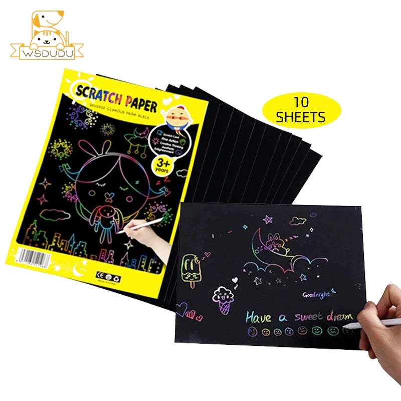 Nos supports sont pensés pour accompagner l'enfant dès qu'il commence à vouloir laisser sa trace. Le coloriage magique à l'eau est idéal dès 3 ans, car il permet de manipuler un pinceau sans aucun risque de taches. L'ardoise numérique et le papier à gratter sont parfaits pour les enfants de 3 à 10 ans, s'adaptant à leur évolution : du gribouillage premier aux dessins plus complexes et à l'apprentissage de l'écriture.